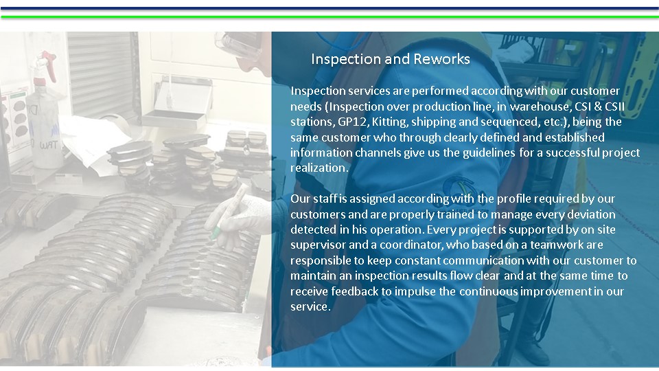 At SQS we ensure that our staff meets the profile ProductAudit required to ensure compliance with our customers requirements, however all our operations have a technical support that is executed before and during the process of providing the service for not to receive, not do and not send non-conformities to the following process / customer.